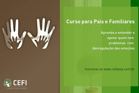 O treinamento do CEFI é baseado na Terapia Dialética Comportamental. Ele se propõe a diminuir o estresse da família, auxiliar na comunicação, reconstruir a confiança, trocar a ira pela empatia, ajudar aos participantes a entender esta desordem e ensinar habilidades para melhorar a qualidade da relação familiar. O curso vai ser realizado em 12 encontros semanais. Inscreva-se. www.cefipoa.com.br