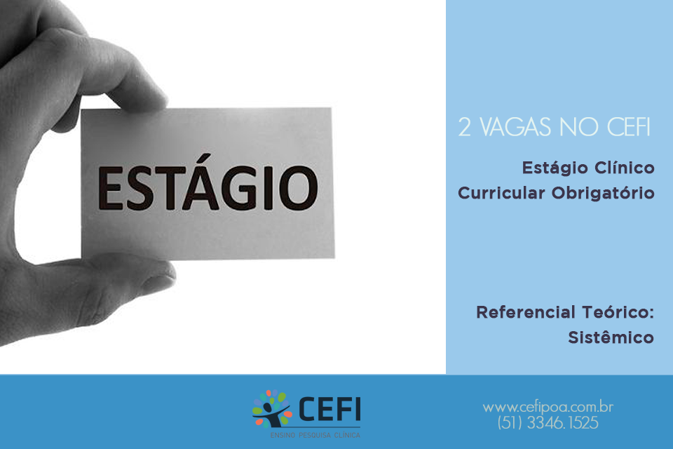 See the documentation you need to present at CEFI: photo curriculum, transcript, autobiography and proof of enrollment (from the 7th semester on 2017/2). To participate, it is essential to enjoy working in teams and having hours available on Mondays from 8am to 4pm, Wednesdays from 8am to 4pm. The planned activities are: individual and family co-therapy, mirror room staff, theoretical seminars, case supervision, team meetings and research group.